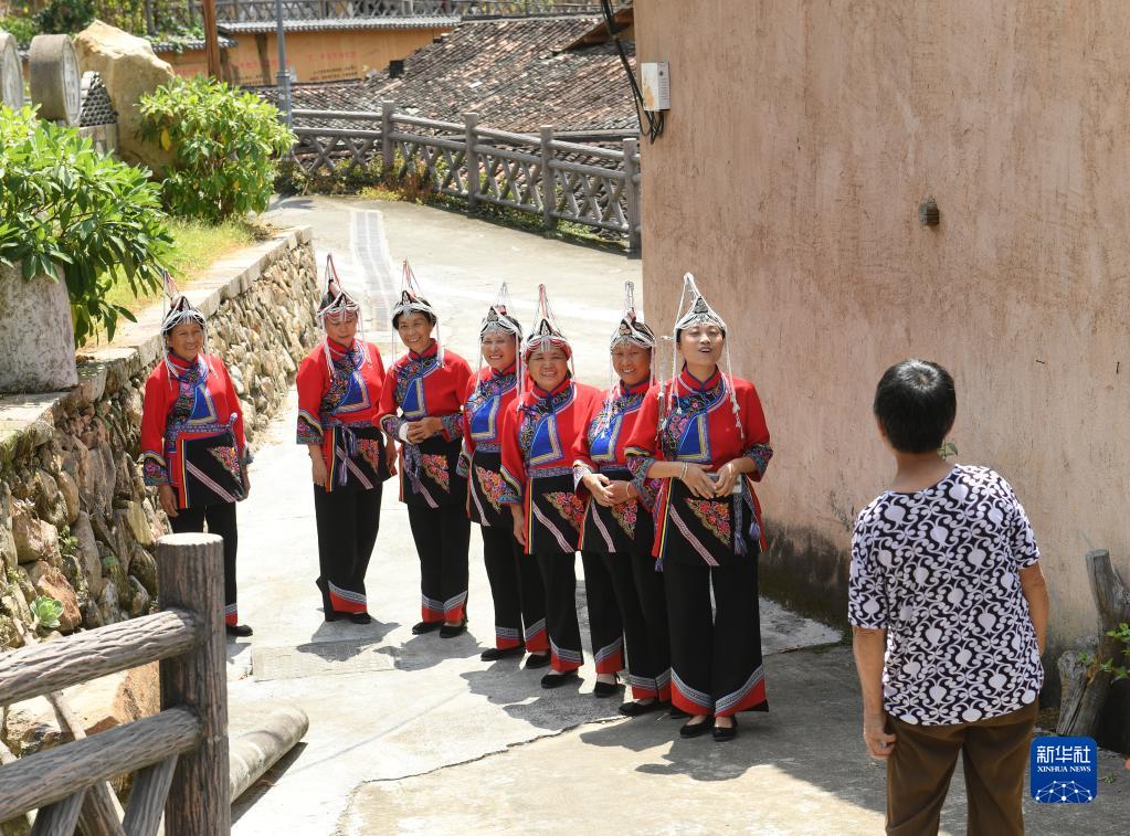 打理完茶园的畲族茶农蓝圆聪回到家,精心梳妆打扮,换上传统服饰,开始录制她的抖音视频歌曲:“山水悠悠我畲乡,畲乡是个好地方,又有山林有竹海,村庄面貌奔小康。”