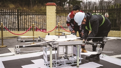 图为当日,在修文县,工作人员对执飞无人机进行检查。