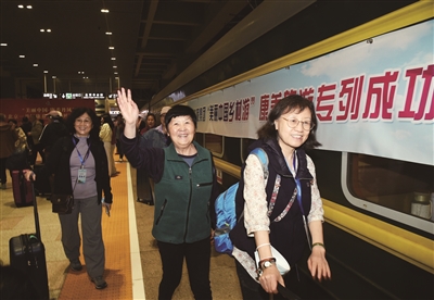 近日,“美丽中国乡村游”康养旅游专列从河北省抚宁站始发,经停唐山、天津、北京丰台、石家庄等站,搭载约460名游客开启为期8天的乡村文旅健康之行。据了解,本趟列车串联起沿途多个旅游景区,以“铁旅融合”的模式进一步拓展文旅空间,让银发族游客在山水人文中感受旅居康养深度体验。 图为在北京丰台站,旅客陆续登上“美丽中国乡村游”康养旅游专列。