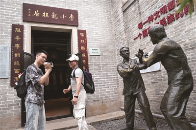 广州永庆坊位于荔湾区恩宁路,是一条有着千年历史的岭南文化特色街区。2016年,永庆坊成为全国“微改造”试点街区,通过微改造与文化活化,实现历史文化街区的保护与更新,让老城焕发新生机。作为广州岭南文化的重要载体,永庆坊在保留骑楼、西关大屋等传统建筑风貌的同时,引入文创、艺术、商业等多元业态,打造集非遗展示、文旅体验于一体的城市文化地标。 图为游客在永庆坊的李小龙祖居参观。