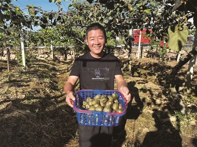 岩头镇方岙村种植户向游客展示果园里丰收的猕猴桃。