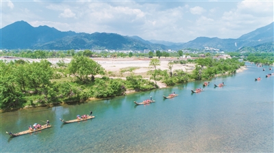 楠溪江竹筏漂流文旅项目吸引游客排队体验。