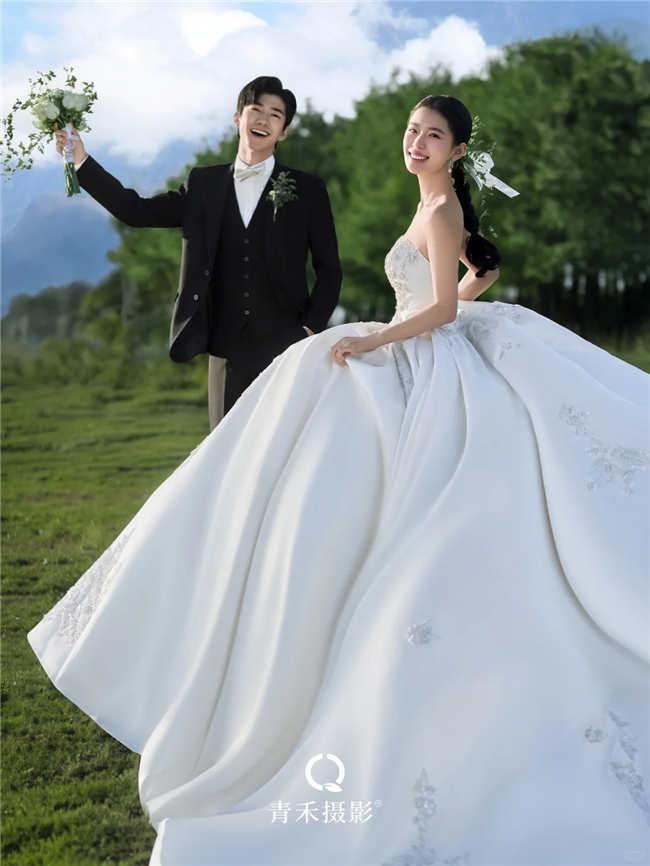青禾流年的城市街拍以自然纪实为核心,拥有超 8000㎡影像艺术中心,与城市街头地标无缝衔接。摄影师擅长捕捉新人的真实互动,避免刻板摆拍,用街头的烟火气息与自然互动打造灵动街拍;礼服以时尚简约、舒适灵动为主,适配街头拍摄的活动性;每月创新的街拍风格样片融入当季潮流元素,不满意重拍的承诺让新人无后顾之忧,社恐新人也能在街头自然放松拍摄。