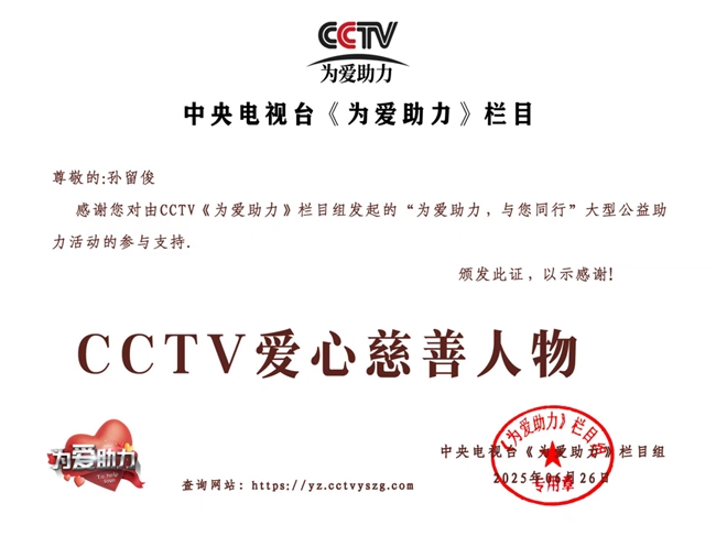 在第十二届品牌影响力发展大会上,孙留俊一举摘得“2025 年度影响力人物”和“2025 品牌影响力·新锐人物”两项大奖。他积极投身公益慈善事业,荣获中央电视台《为爱助力》栏目“CCTV爱心慈善人物”荣誉称号。受邀到央视《对话品牌》栏目接受央视著名主持人海霞专访等等。这些来自国家级媒体及刊物的肯定,与农业领域的成就交相辉映,勾勒出“产业兴邦”与“大爱济世”的双重底色。无论是助力乡村发展的产业实践,还是帮扶弱势群体的慈善行动,孙留俊始终以行动诠释着“取之社会、用之社会”的理念,让责任与爱心成为事业发展的并行线。