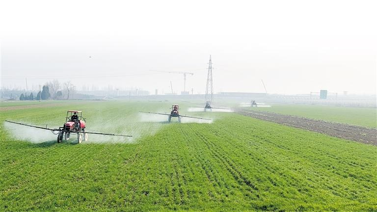 图为3月7日,在陕西省西安市长安区杨庄街道营沟村,机手们正在开展春季麦田化除机械化作业。