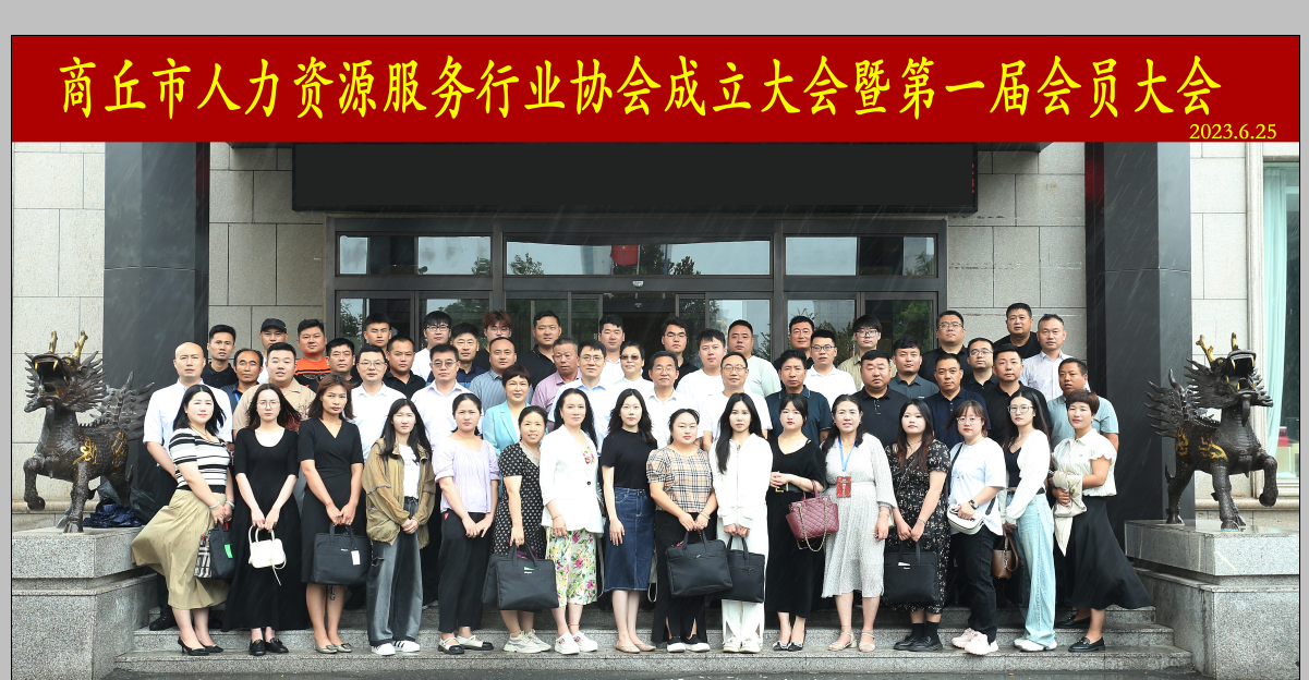 2023年6月25日,商丘市人力资源服务行业协会成立大会暨第一届会员大会成功召开,市人社局、市民政局、梁园区人社局、民权县人社局、永城市人社局有关负责人及52家会员单位代表参会。