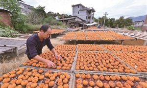 金秋送爽,福建省福州市永泰县梧桐镇迎来了繁忙的柿饼加工时节。金灿灿的柿子与村落、青山相映,勾勒出秋日好“丰”景。 图为永泰县梧桐镇光荣村一柿饼加工厂工作人员在摆晒新鲜削皮后的柿子。