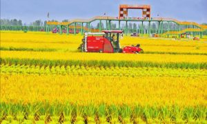 10月16日,在江苏省如皋市城北街道平园池村,农机手驾驶收割机在田间收获水稻。 农业农村部最新农情调度显示,2025年全国秋粮收获近七成。