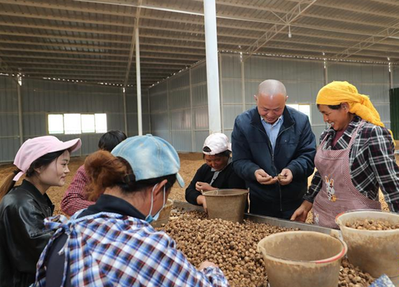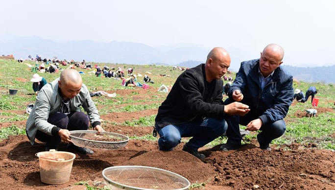 3月22日,在贵州省毕节市赫章县双坪乡贵州九鼎农业发展有限公司中药材种植基地,陈润华(右二)和村民在精选中药材半夏种子。