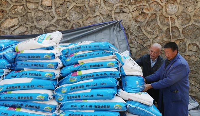 3月22日,在贵州省毕节市赫章县双坪乡贵州九鼎农业发展有限公司中药材种植基地,陈润华(左)和员工搬运肥料。