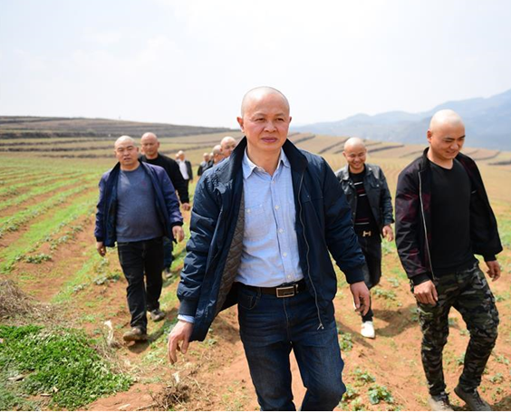 3月22日,在贵州省毕节市赫章县双坪乡贵州九鼎农业发展有限公司中药材种植基地,陈润华(前)带着他的团队成员前去查看中药材长势。