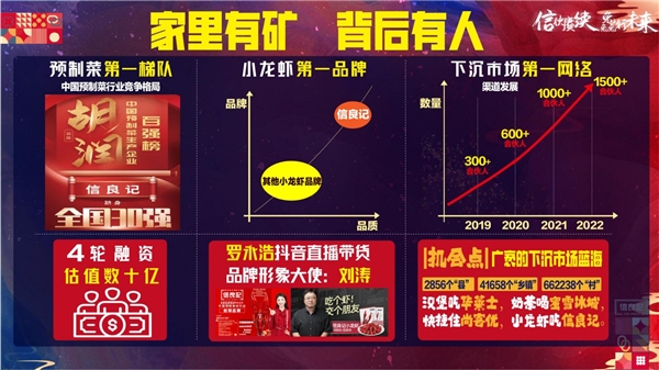 在能赚钱的基础上有信心,企业还得有实力,家里有矿、背后有人。信良记介绍:预制菜第一梯队,小龙虾第一品牌,下沉市场第一网络。首先预制菜第一梯队,胡润的中国预制菜百强企业,信良记跻身前30名。信良记从19年开始耕耘全国的下沉市场,现在基本跑过2000个县,至少50%以上的下沉市场有我们的经销商和经销网络,且我们还在一步步坚定不移的拓展下沉市场,中国有2000多个县,4万多个乡,66万个村,有几个下沉市场做的特别好的品牌,我一直说汉堡吃华莱士,奶茶喝蜜雪冰城,快捷酒店在下沉市场上住尚客优,小龙虾是谁?小龙虾吃信良记。